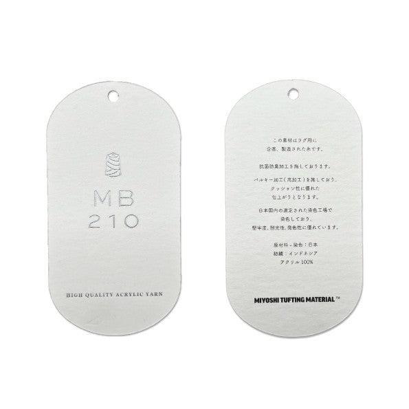MIYOSHI TUFTING MATERIAL® 株式会社三好敷物が企画するタフティングラグ用に製造された高品質なアクリル毛糸 MB210 です。三好敷物の製品でも使用されております。 糸購入1回ごとに1枚、資材証明タグをお付けいたします。 製作頂いた作品に取り付け、MB210の糸の使用を証明するタグとしてご使用いただけます。 AK-1(他AKシリーズ)でのタフティングに適したアクリルの毛糸。AK-1では5本取りでのご利用をオススメしております。 250gずつのコーンでの販売となりますので、同色を5本取りする場合は5つご購入いただくか、玉巻機も一緒にご購入いただき必要な量を取り分けながらご使用ください。 ※同じカラーでも、生産時期により約5%程度の色味の誤差が生じる場合がございます。あらかじめご了承くださいませ。